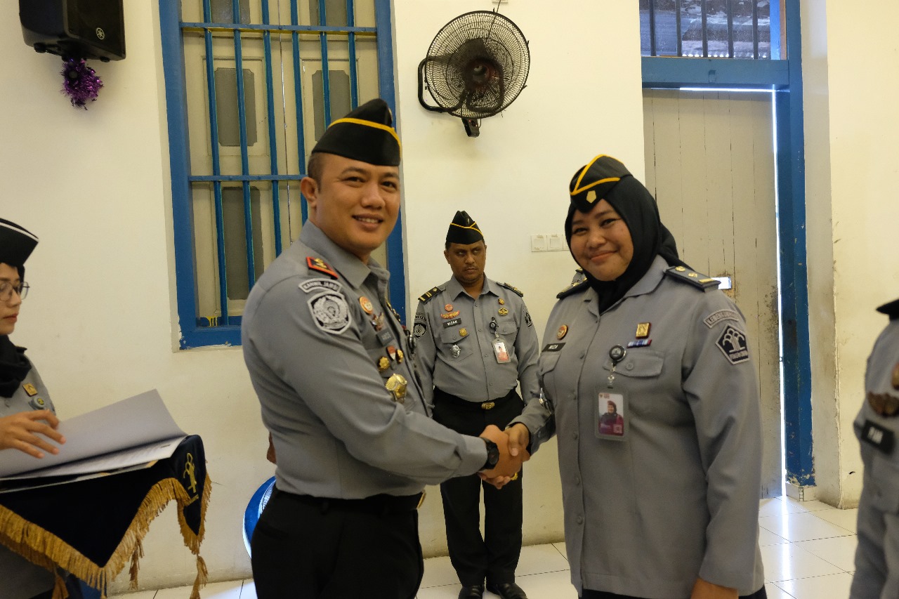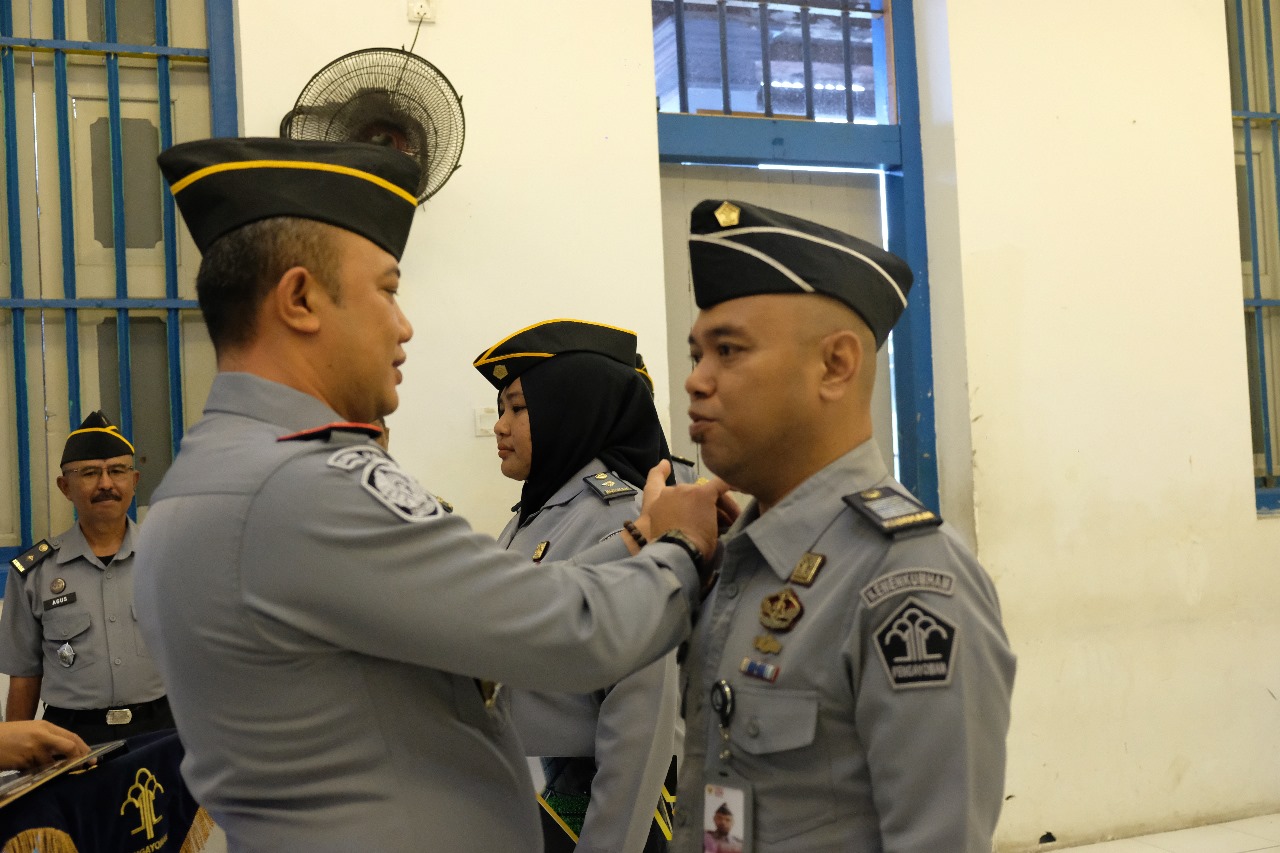 Raut kebahagiaan terpancar dari wajah ketiga pegawai tersebut saat Kepala Rutan secara simbolis menyematkan tanda pangkat baru dan menyerahkan Surat Keputusan kenaikan pangkat kepada mereka.
