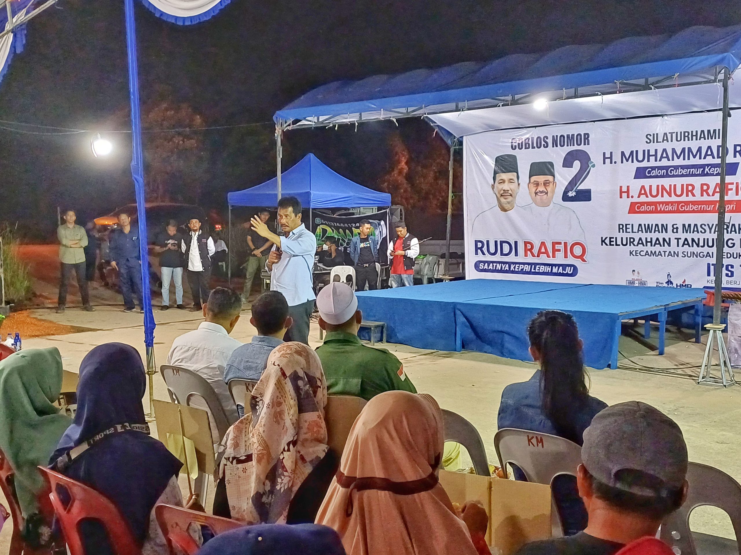 Seperti yang tampak dalam acara Silaturahmi dan Kampanye Dialogis Paslon Gubernur dan Wakil Gubernur Kepulauan Riau (Kepri) nomor urut 2, HMR, dan H Aunur Rafiq (Rudi- Rafiq), di halaman ruko Buana Garden, Kelurahan Tanjungpiayu, Seibeduk, Batam, Selasa (15/10/2024), malam.