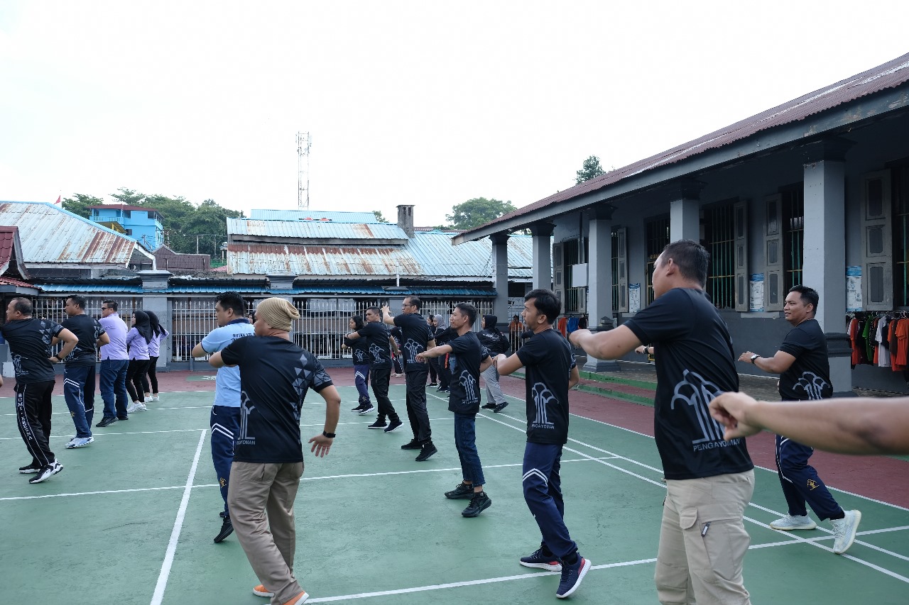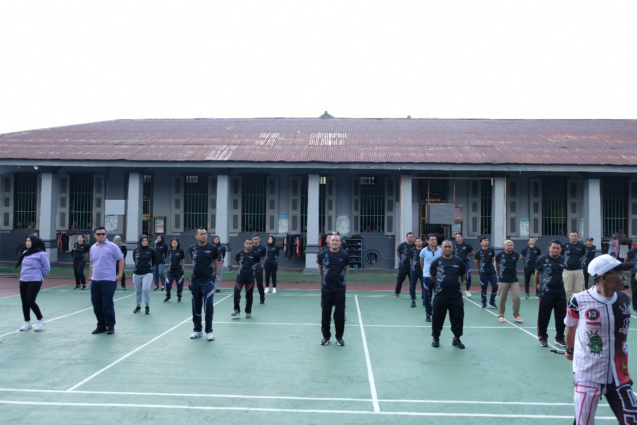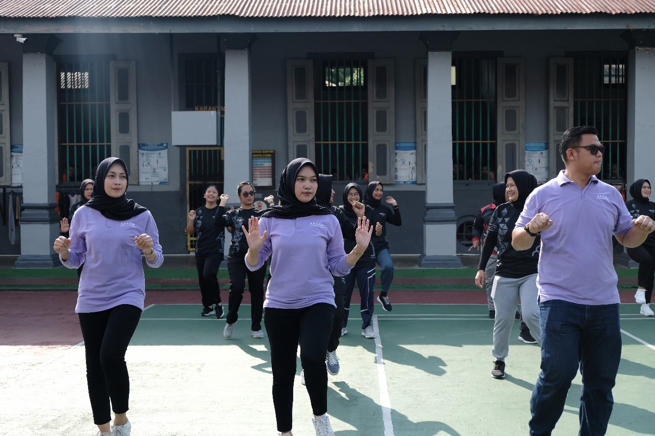 TG.PINAG, Vitomedia.id – Kepala Rutan Kelas I Tanjungpinang, Yan Patmos, beserta pejabat struktural, pegawai, dan warga binaan mengikuti kegiatan senam bersama yang berlangsung di Lapangan Blok Bintan, Jumat (18/10). Kegiatan senam ini merupakan hasil kolaborasi antara Rutan Kelas I Tanjungpinang dengan Bank BJB, yang menghadirkan instruktur senam untuk memandu acara.