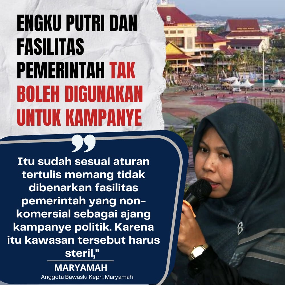 “Itu sudah sesuai aturan tertulis memang tidak dibenarkan fasilitas pemerintah yang non-komersial sebagai ajang kampanye politik. Karena itu kawasan tersebut harus netral,” tegas Anggota Bawaslu Kepri, Maryamah.