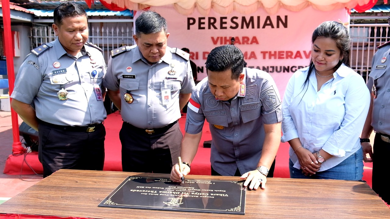 TG.PINANG,Vitomedia.id – Dalam upaya menjamin hak keagamaan dan mendukung pembinaan karakter positif bagi warga binaan, Kepala Kantor Wilayah Kemenkumham Kepulauan Riau, I Nyoman Gede Surya Mataram, meresmikan Vihara Cetiya Tri Dharma Theravada di Rutan Kelas I Tanjungpinang pada Selasa (29/10). Peresmian berlangsung di lapangan Rutan dan dihadiri pimpinan tinggi pratama Kemenkumham Kepri, di antaranya Kepala Divisi Pemasyarakatan, Dannie Firmansyah; Kepala Divisi Administrasi, Kaswo; serta perwakilan dari instansi daerah dan seluruh Kepala Unit Pelaksana Teknis Pemasyarakatan dan Imigrasi se-Tanjungpinang- Bintan.